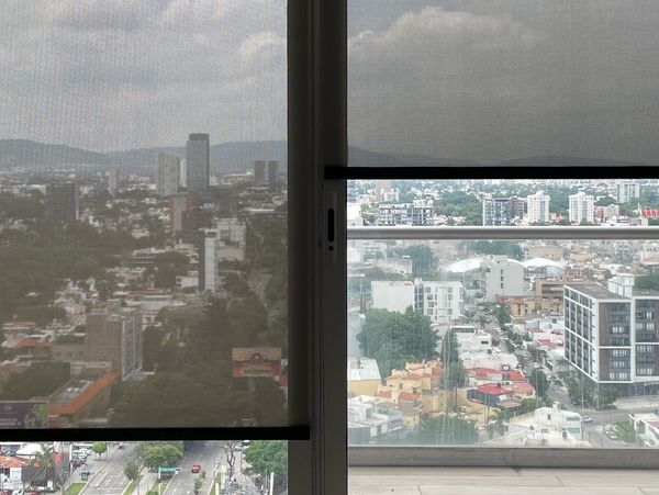 Persiana enrollable semi traslúcida, con filtro UV del 100% con privacidad día y noche pero sin visibilidad desde el interior.